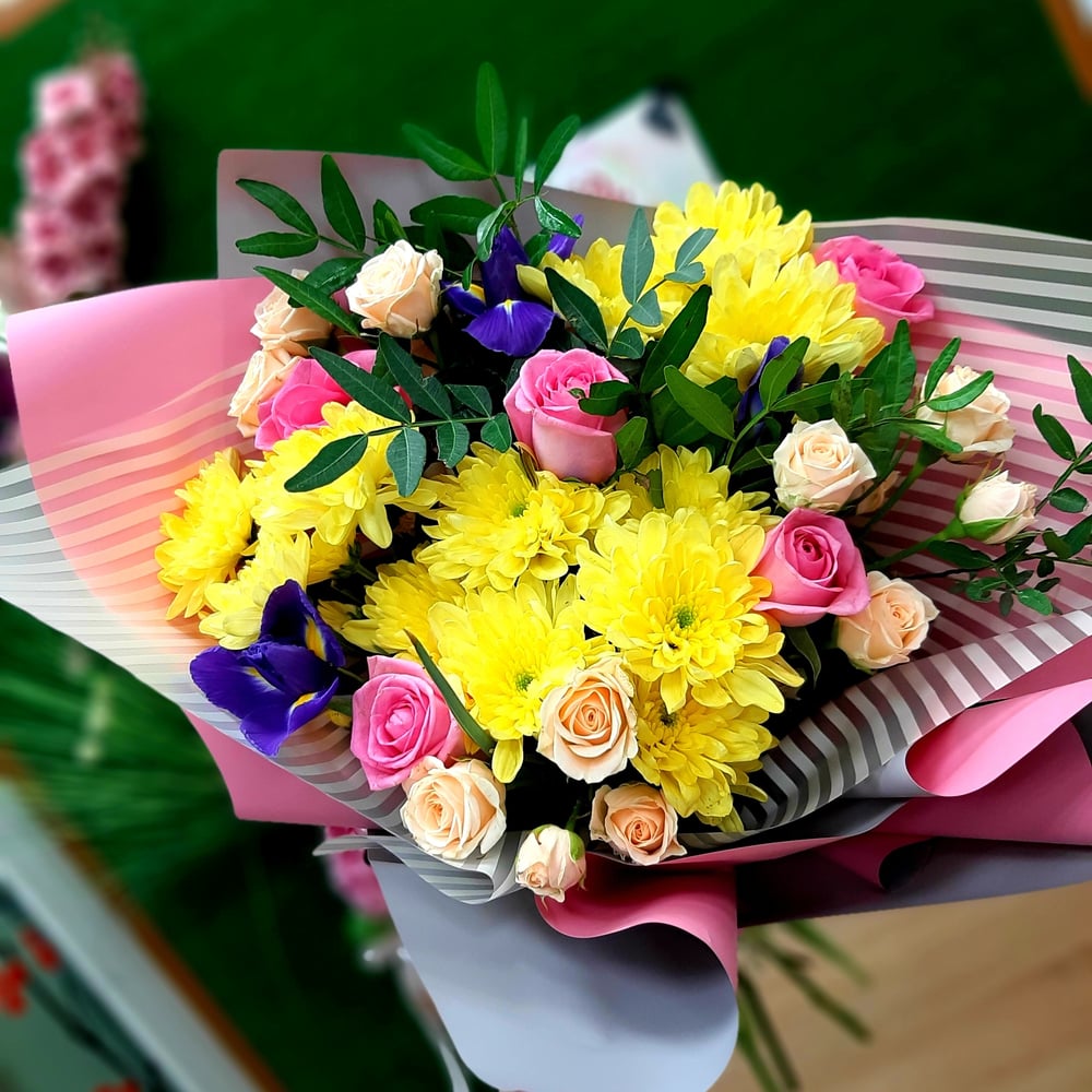 Букет «Лужайка» из роз и ирисов