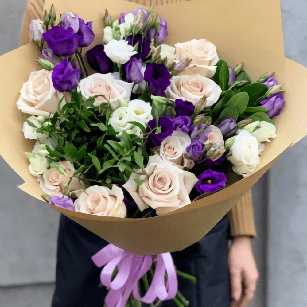 Красивая гамма в сочетании нежно-розовой розы с сиреневой эустомой.