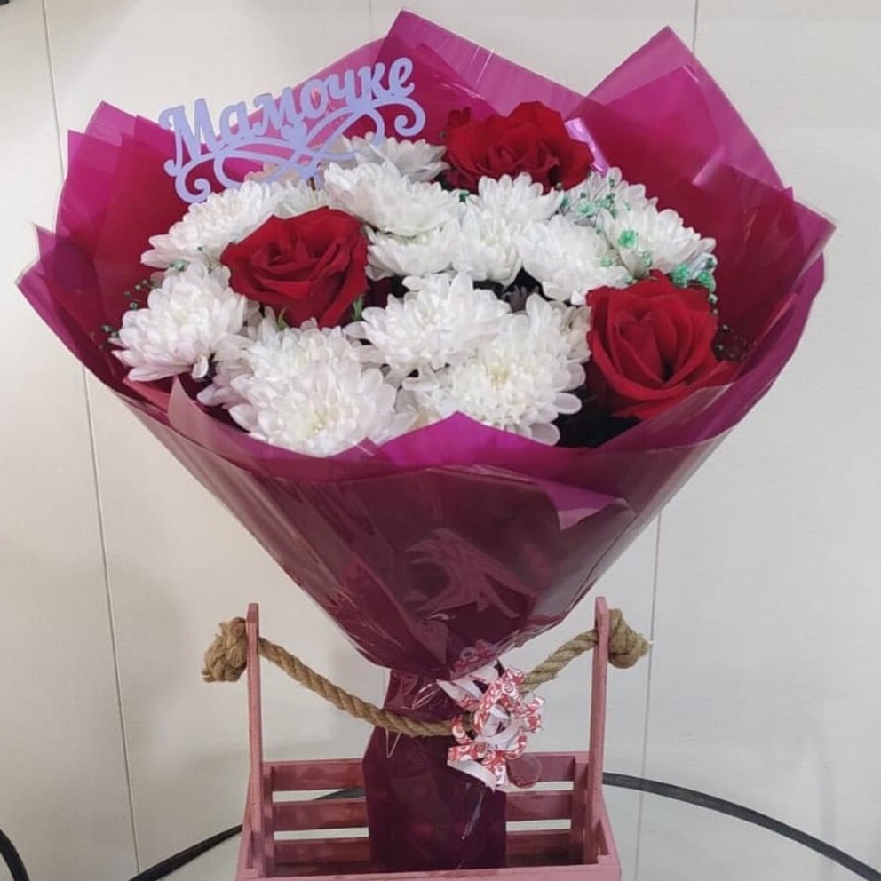 Букет «Лёд и пламя с топпером» из хризантем и роз
