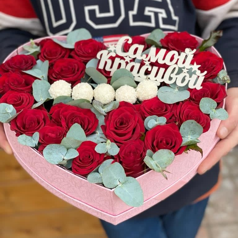 Коробка в форме сердца с розами и конфетами рафаэлло.