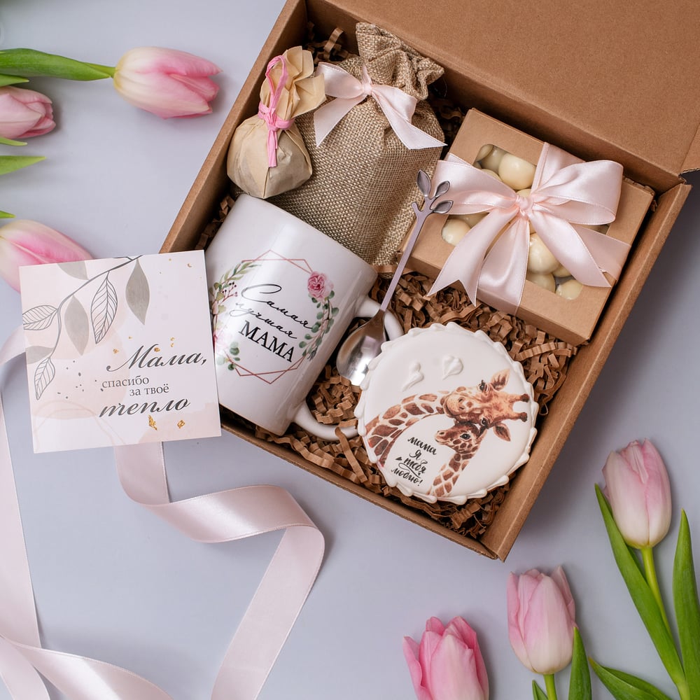 Что подарить в подарок самому близкому и дорогому человеку на свете маме? Идеальный подарок подарочный бокс, с уютными мелочами и вкусными лакомствами. В состав подарочного набора сладостей входит: керамическая кружка с надписью Самая лучшая мама, черный листовой чай с ароматом Лесные ягоды (50 г), чайная ложка, фундук в белом шоколаде (150 г), карамельный пряник жираф, конфета ручной работы, открытка. Подарочный набор оформлен в стильной крафтовой коробке с атласной лентой. Подарочные сладости отлично подойдут для подарка маме или бабушке на день рождения, 8 марта, юбилей, День Матери. Или не ждите поводов, а радуйте своих любимых просто так!!