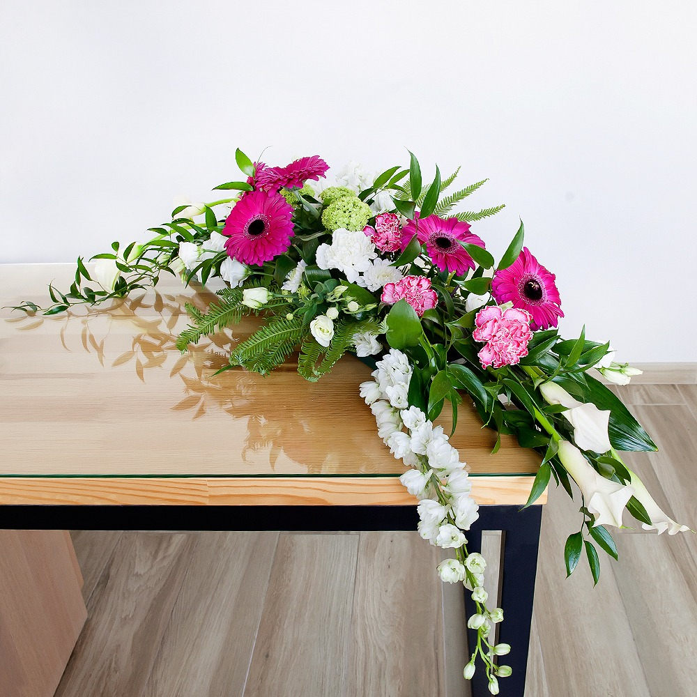 A touching composition of fresh gerberas, calla lilies and lisianthus will convey your sincere condolence and respect towards the deceased.