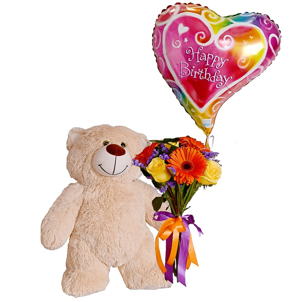 Только взгляните на этого милого плюшевого мишку с красивым букетом цветов и праздничным шариком в форме сердца! Он наверняка порадует вашу любимую!