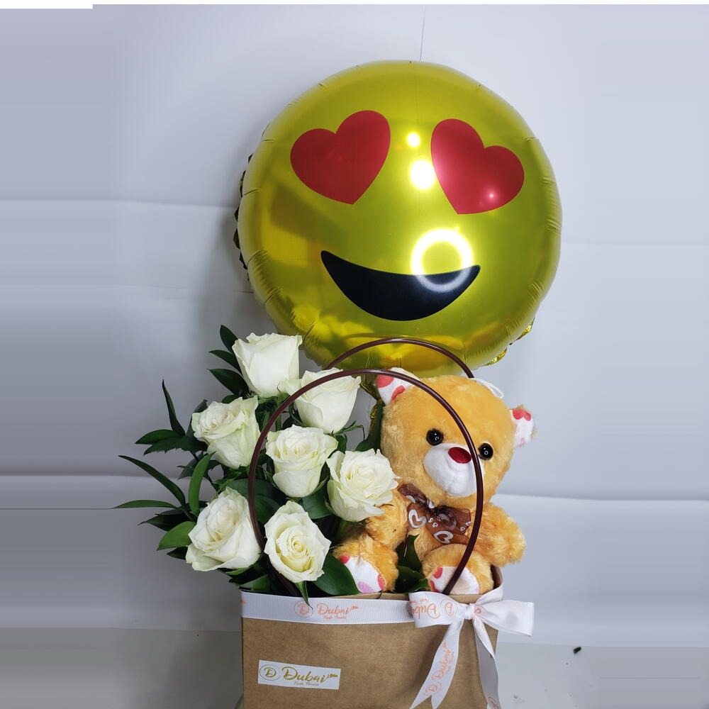 Медвежонок - 1 шт. подарочный пакет - 1 шт. белые розы - 8 шт. фольгированный шар - 1 шт.