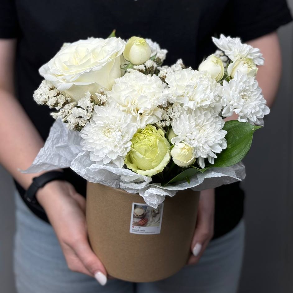Шляпная коробка с хризантемой и ароматной розой.