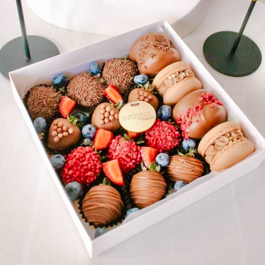Наш хит продаж! 2 десерта в одном наборе, клубника в бельгийском шоколаде Barry Callebaut и пухлые макарунс. 12 клубник в молочном бельгийском шоколаде с посыпками 4 макарона микс (бывают вкусы лимончик, сникерс, малина-фисташка и клубника со сливками) в набор идут вкусы в зависимости от наличия в этот день! 2 макарона покрыты наполовину шоколадом. Набор упакован в белую коробку с окном и атласной лентой, доставляется в картонном пакете с окном и нашей фирменной карточкой. Набор изготавливается по вашему заказу в день заказа.