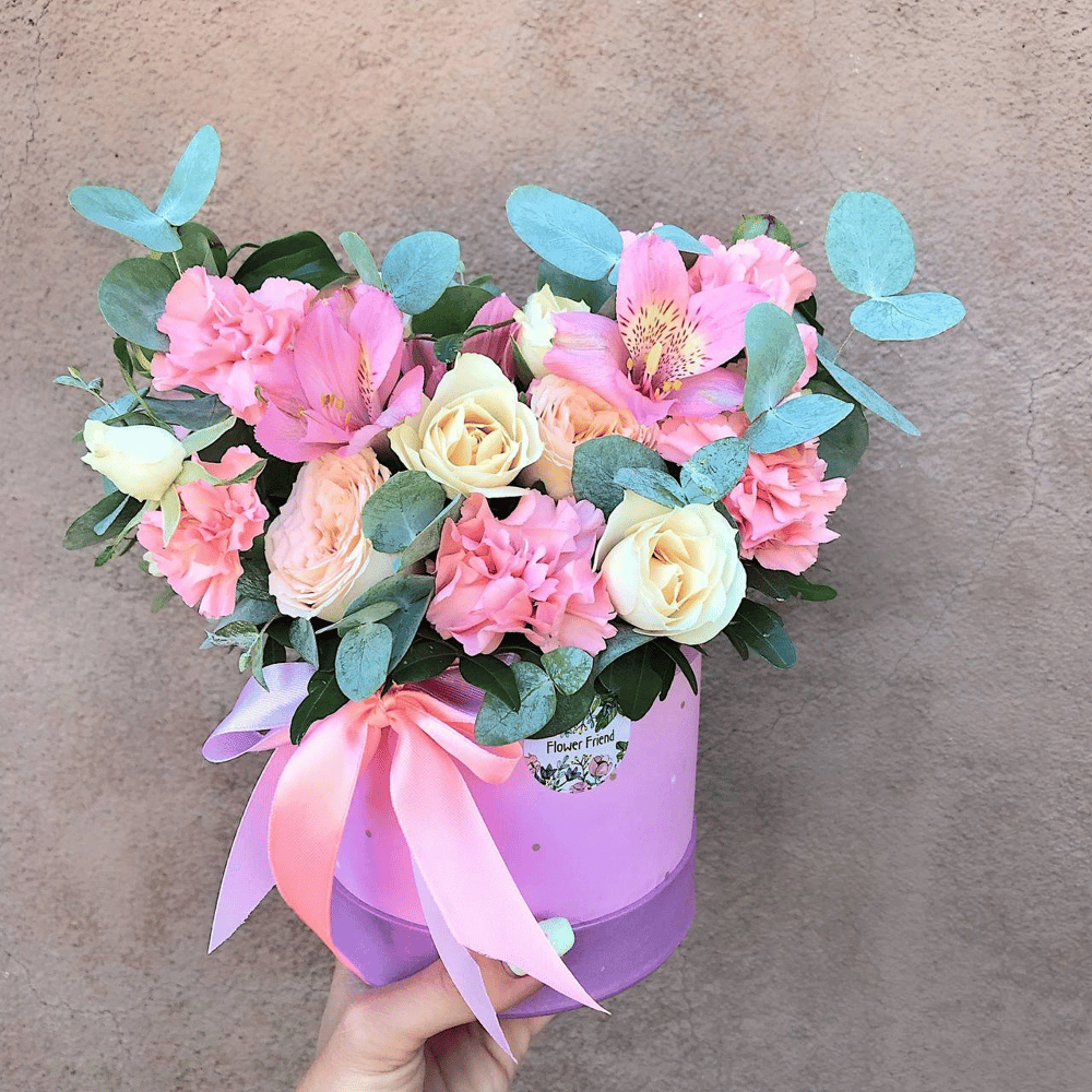 Шляпная коробка с цветами «Малиновое облако» из роз и гвоздик