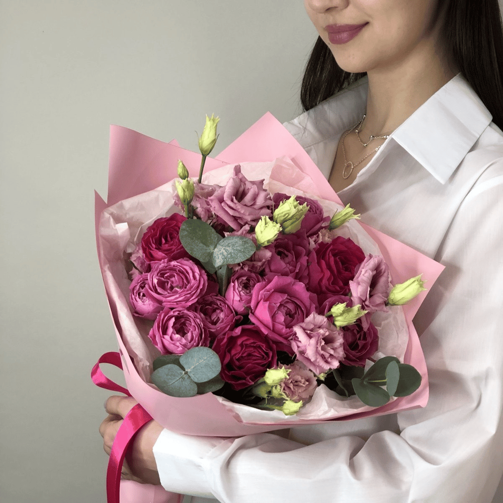 Яркий и оригинальный букет из разных роз в малиновой гамме. Отличный вариант для подарка близким и любимым.