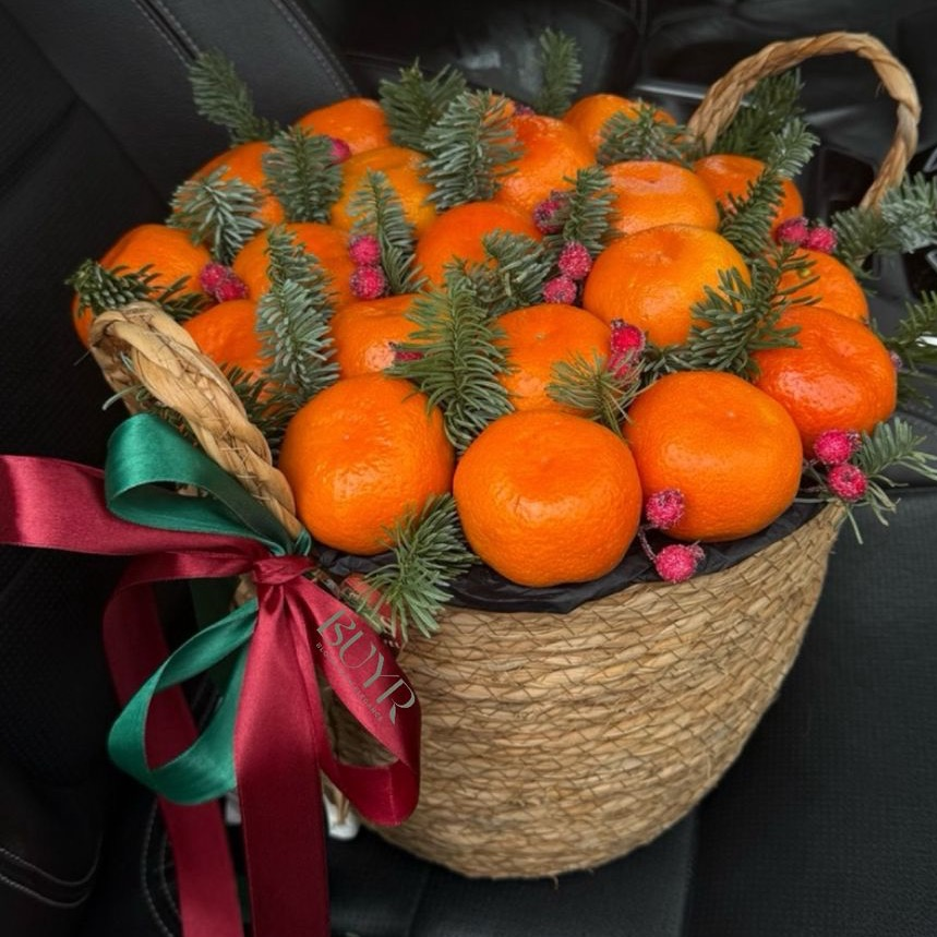 Яркая и ароматная новогодняя композиция в плетёной корзине с сочными мандаринами и свежей хвойной зеленью. Натуральные еловые ветви, декоративные ягодки и праздничные ленты создают ощущение уюта, тепла и настоящего Нового года. Этот букет не только красив, но и вкусен — символ достатка, радости и праздничного стола. Идеальный подарок для дома, офиса, коллег, друзей и близких в новогодние дни 🎄✨ Состав: Свежие мандарины, ель натуральная, декоративные ягоды, атласные ленты, плетёная корзина.