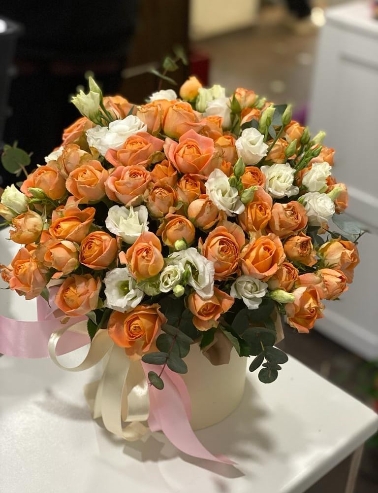 Шляпная коробка с цветами «Маргарит» из роз и эустом