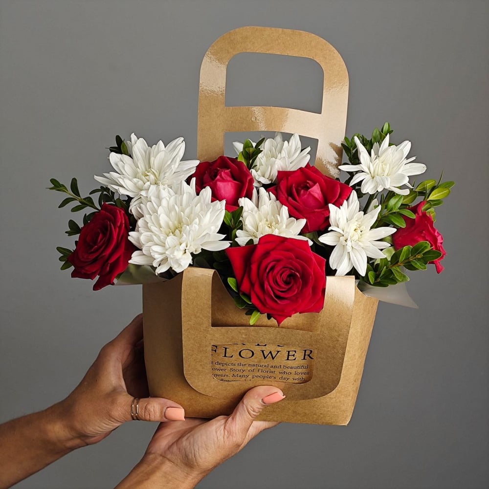 Элегантная композиция из красных роз и белой кустовой хризантемы.