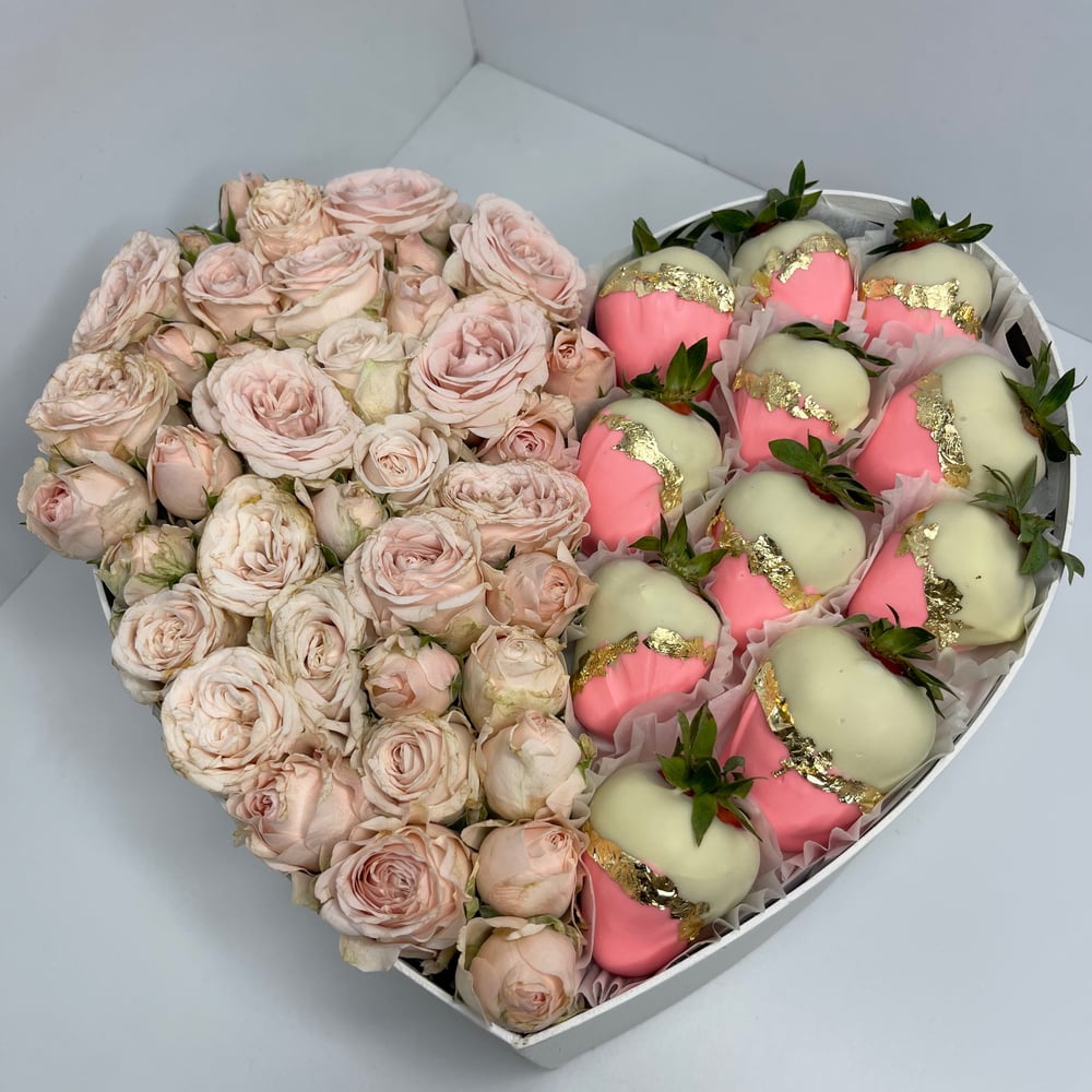 Коробка сердце с цветами и клубникой в шоколаде