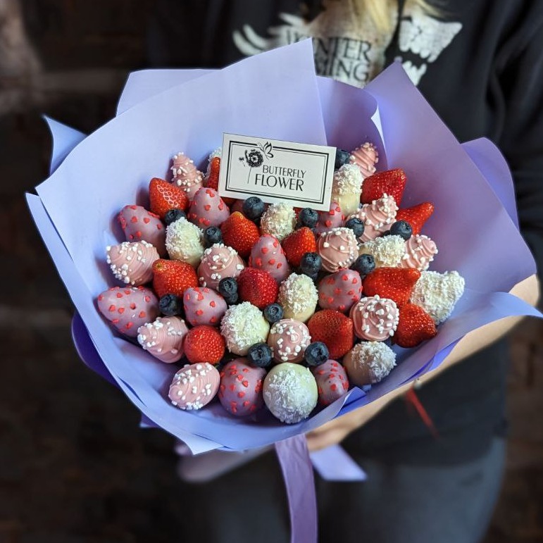 Съедобный фруктовый букет из клубники в шоколаде и голубики