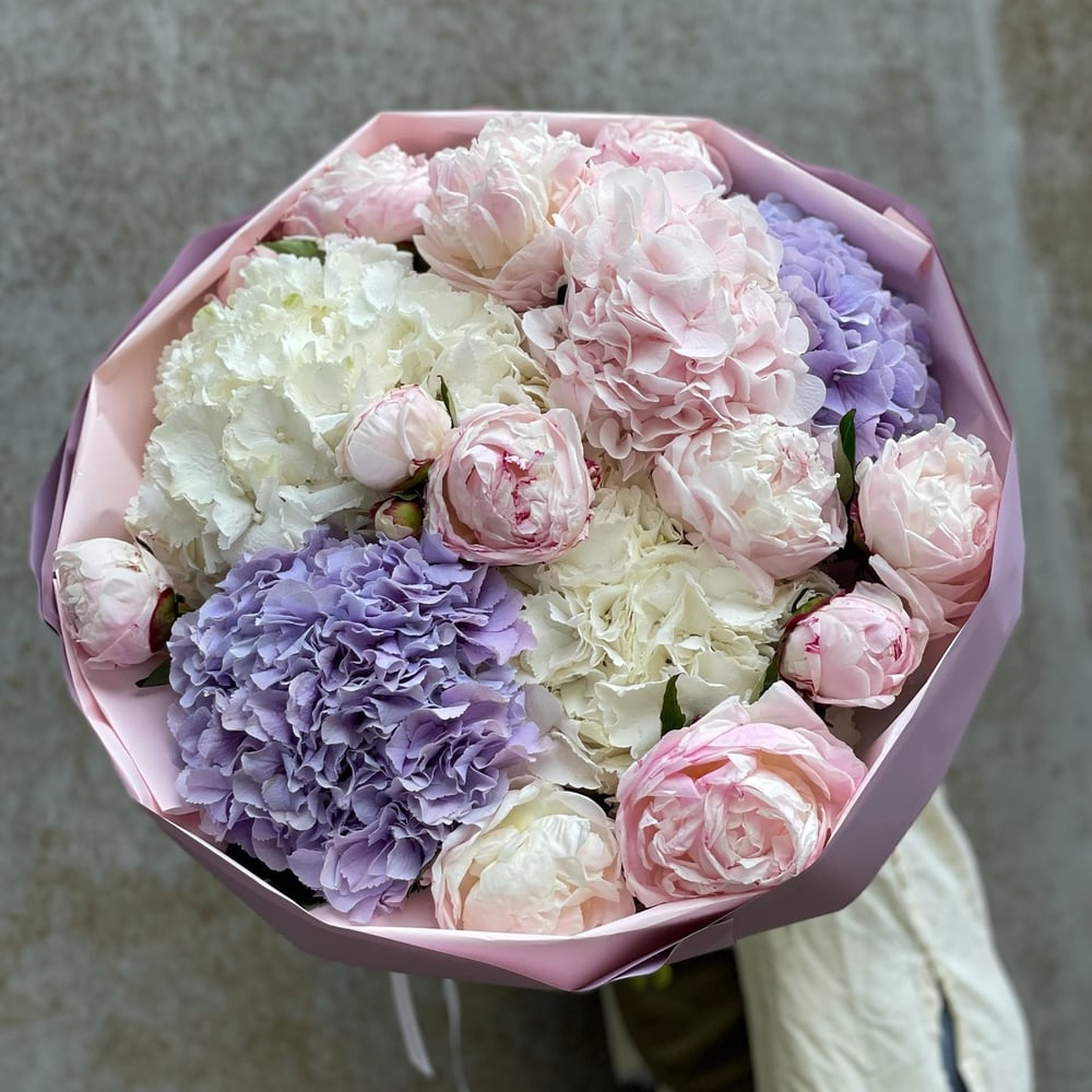 Букет из гортензий и пионов. При отсутсвии какого либо цветка, салон в праве заменить его на равноценный по согласованию с заказчиком. Результат будет максимально схожий с исходным вариантом.