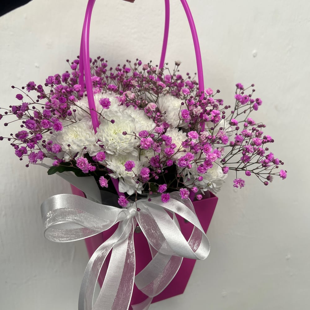 Нежный и изящный букет, включающий в себя красивые белые хризантемы сантини и нежную гипсофилу. Благодаря оригинальной упаковке в виде сумочки, букет выглядит особенно стильно и элегантно. Оазис в упаковке помогает сохранить свежесть цветов, а яркая лента добавляет законченность и изысканность композиции. Этот букет подарит радость и удовольствие своему получателю, будь то дорогая любимая женщина или уважаемый коллега.
