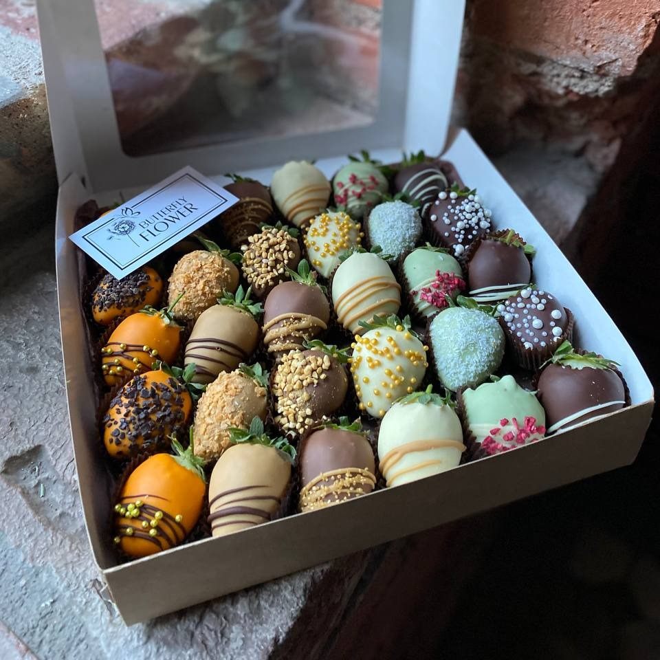 Композиция из клубники в шоколаде в дизайнерской коробке