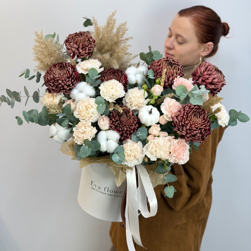 Шляпная коробка с цветами «Мега осенняя композиция с тыквой» из гвоздик и роз