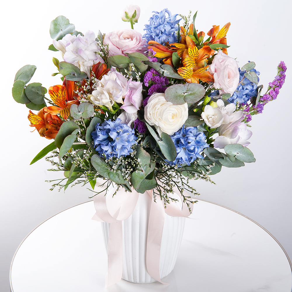 Цветы в этом букете создают удивительную гармонию природы. Элегантные гиацинты, милые фрезии, нежные ранункулюсы, яркие альстромерии и лимониум создают мелодию цветов и ароматов. Эвкалипт дополняет композицию, а современная упаковка дополняют композицию, идеально выражая самые светлые чувства.