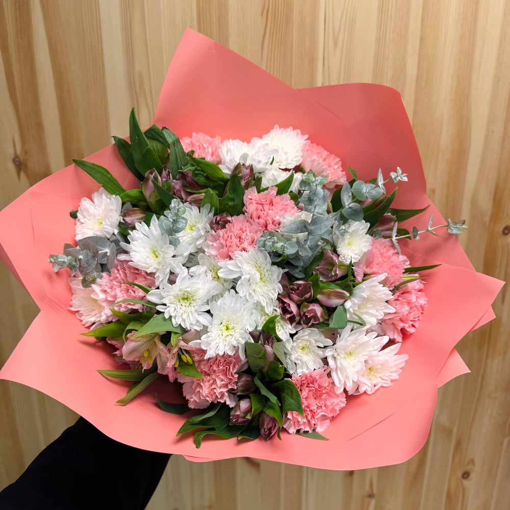 Очаровательная композиция из пушистой хризантемы и нежной альстромерии, подарит по настоящему весеннее настроение и улыбку, важному для Вас человеку. Эмоции в Вашем букете доставит наш пунктуальный и вежливый курьер.