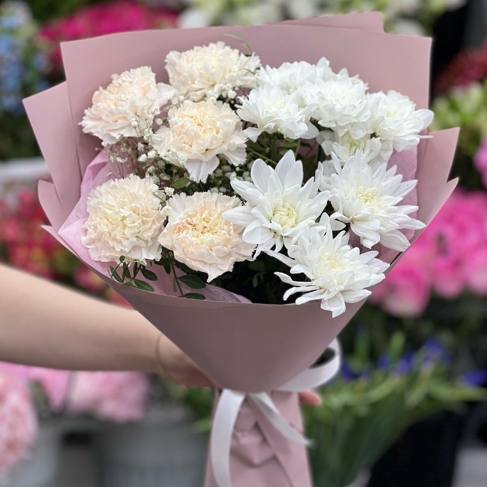 Нежный сочный букет с кустовыми хризантемами и нежными гвочдичками ,в дополнении идет гипсафила