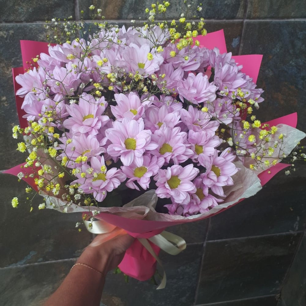 Букет из стойких хризантем и гипсофилы подарит хорошее настроение и порадует любого получателя!