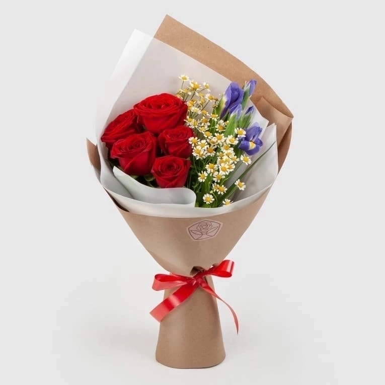Изысканное в своей простоте сочетание классических красных роз с крупными бокаловидными бутонами, белоснежных полевых ромашек с сочной желтой сердцевиной и синих ирисов. | Подарите любимым частичку…
