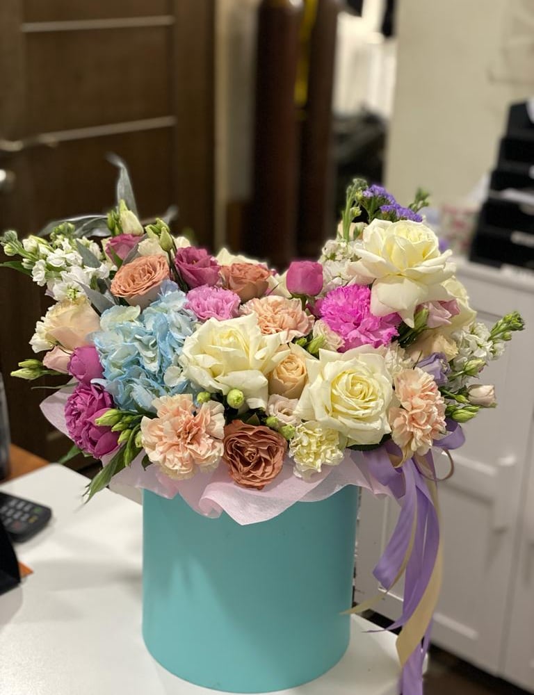 Шляпная коробка с цветами «Мэрилин» из роз и гвоздик