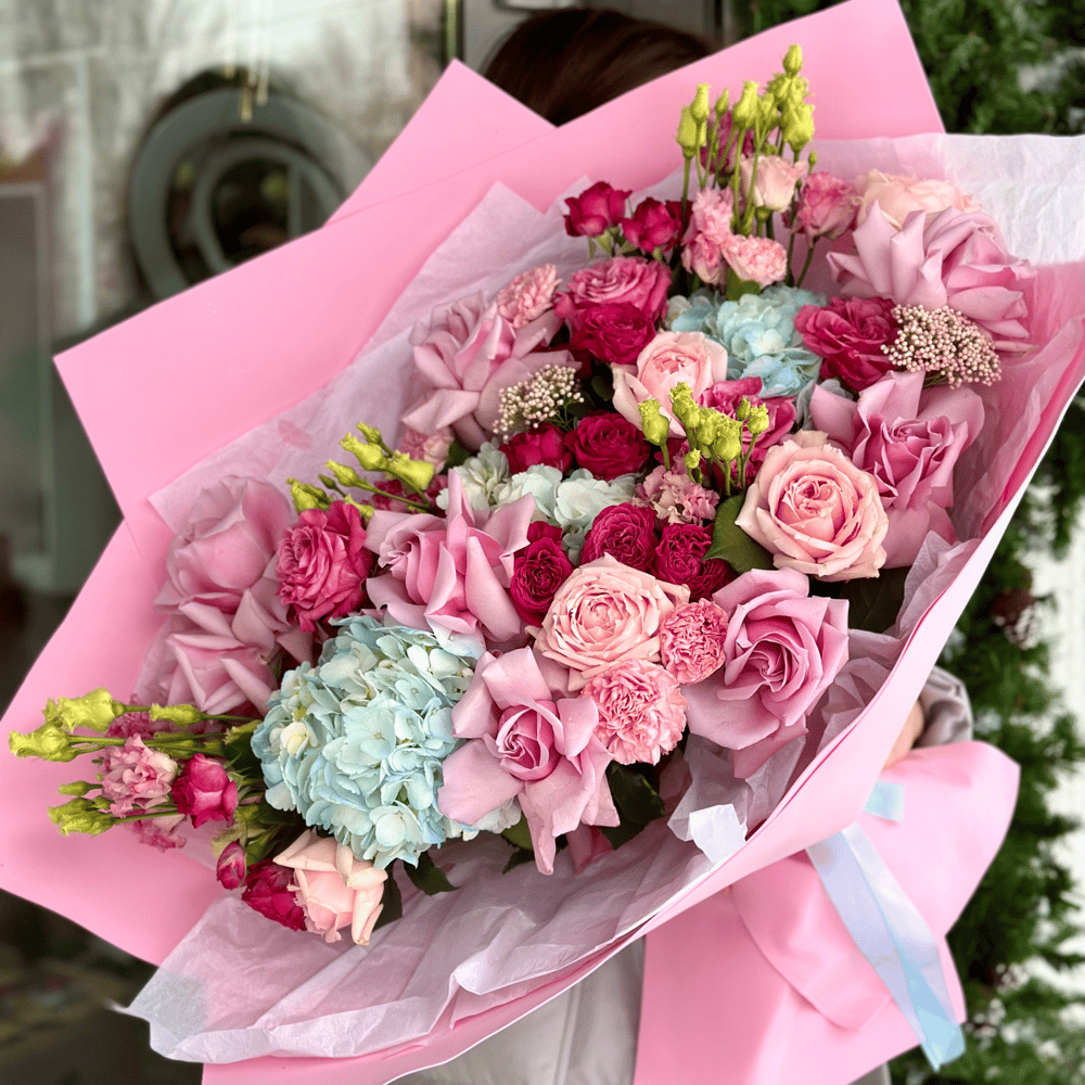 Этот неповторимый букет, в котором сочетаются кустовая и импортная розы, гортензия, пионовидная роза, озотамнус, диантус и эустома, олицетворяет страсть, изысканность и утонченность. Каждый цветок в букете вносит свой уникальный вклад в общую композицию. Белоснежная гортензия и пионовидная роза добавляют нежности и романтики, а кустовая и импортная розы подчеркивают статус и роскошь букета. Озотамнус с его тонким ароматом окутывает букет воздушной свежестью, диантус добавляет яркости, а эустома придает букету уникального шарма. Этот букет - идеальное выражение ваших самых теплых чувств и ярких воспоминаний. Возможна 20% замена составляющих букета с соблюдением стилистики и цветовой гаммы!
