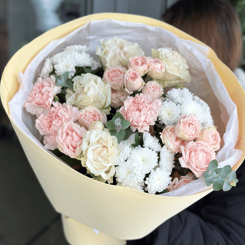 Букет из кустовых роз, пионовидных роз, диантусов, сантини и писташа с добавлением эвкалипта - это прекрасный выбор для тех, кто хочет порадовать своих близких или создать романтическую атмосферу. Кустовые розы отличаются пышными соцветиями и мелкими бутонами, что придает букету нежность и объем. Пионовидные розы имеют пышные, густомахровые бутоны, похожие на пионы, и насыщенные, яркие цвета. Диантусы добавят букету изысканности и шарма. Сантини и писташ придадут воздушность и легкость композиции. Эвкалипт привнесет в букет свежесть и тонкий, приятный аромат. Такой букет будет прекрасным подарком на любой праздник или просто знаком внимания.
