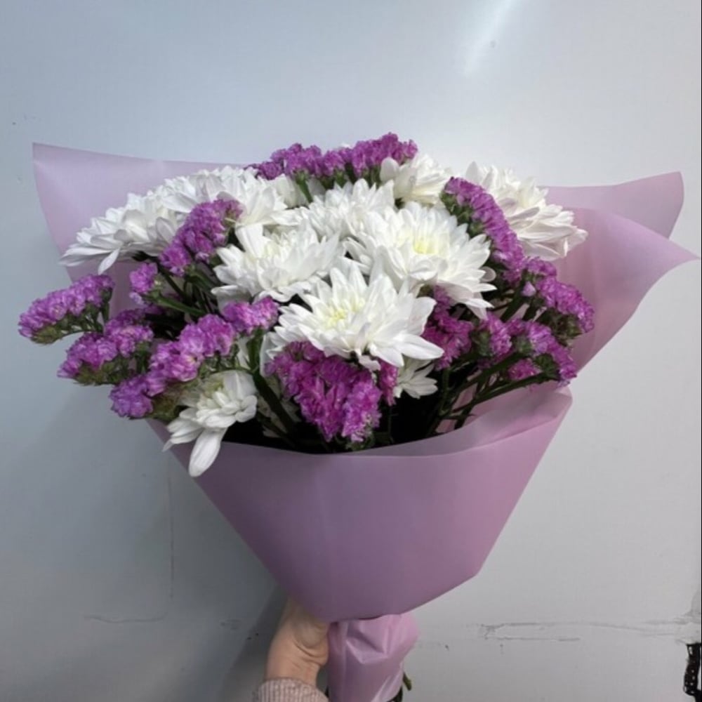 Прекрасный букет собран из нежных хризантем кустовых и изысканной статицы, которая придает ему особый шарм. Оформлен в элегантной авторской упаковке и украшен стильной лентой. Этот букет станет прекрасным подарком для любого торжества и порадует своего получателя нежностью и красотой.