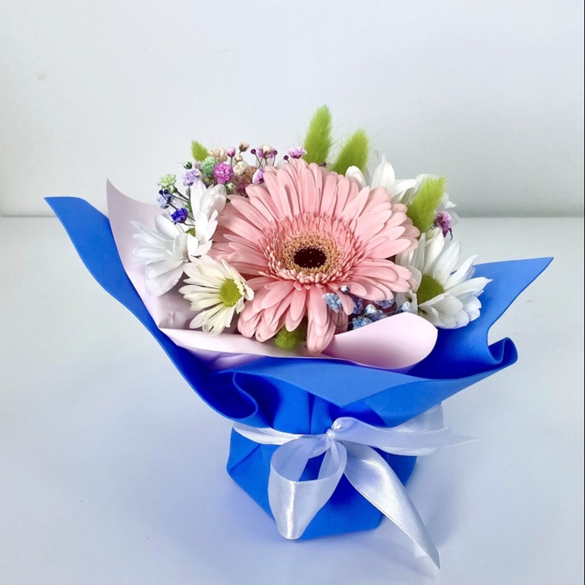 Нежный авторский букет из свежих цветов — очаровательный знак внимания женщине, наполненный трепетом и красотой. Цветочная композиция высотой 15 см в корзинке с атласной лентой составлена из цветков белой кустовой хризантемы, гермини (герберы) в розовом пурпуровом оттенке и гипсофилы. Чтобы цветы стояли дольше, подливайте в коробку с флористической губкой раствор из воды с подкормкой. Необходимо следить, чтобы оазис пиафлор всегда оставался чуть влажным. Подкормка идет в комплекте. Ставьте букет в прохладное место, вдали от солнечных лучей. Разноцветный букет в дизайнерской упаковке станет красивым подарком маме, бабушке, сестре или любимой девушке, жене и подруге. Такую композицию из цветов можно преподнести педагогу, воспитательнице, преподавателю института на День учителя и выпускной, День знаний 1 Сентября, восьмое марта первой учительнице, воспитателю или в качестве поздравления коллеге.