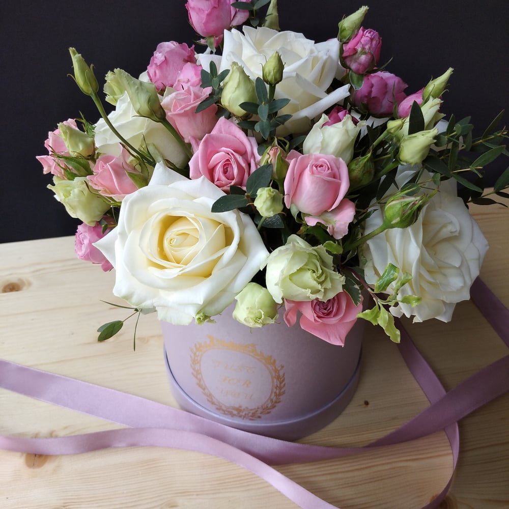 Шляпная коробка с цветами «Миледи» из роз и эустом