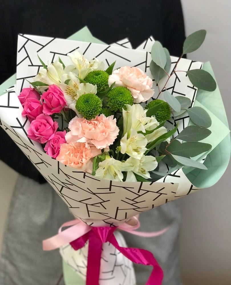 Нежный букет со стойкой альстромерией, ажурными диантусами и благородным эвкалиптом.