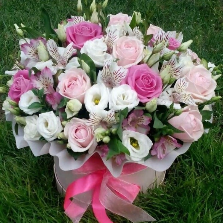 Шляпная коробка с цветами «Милый вид» из альстромерий и эустом