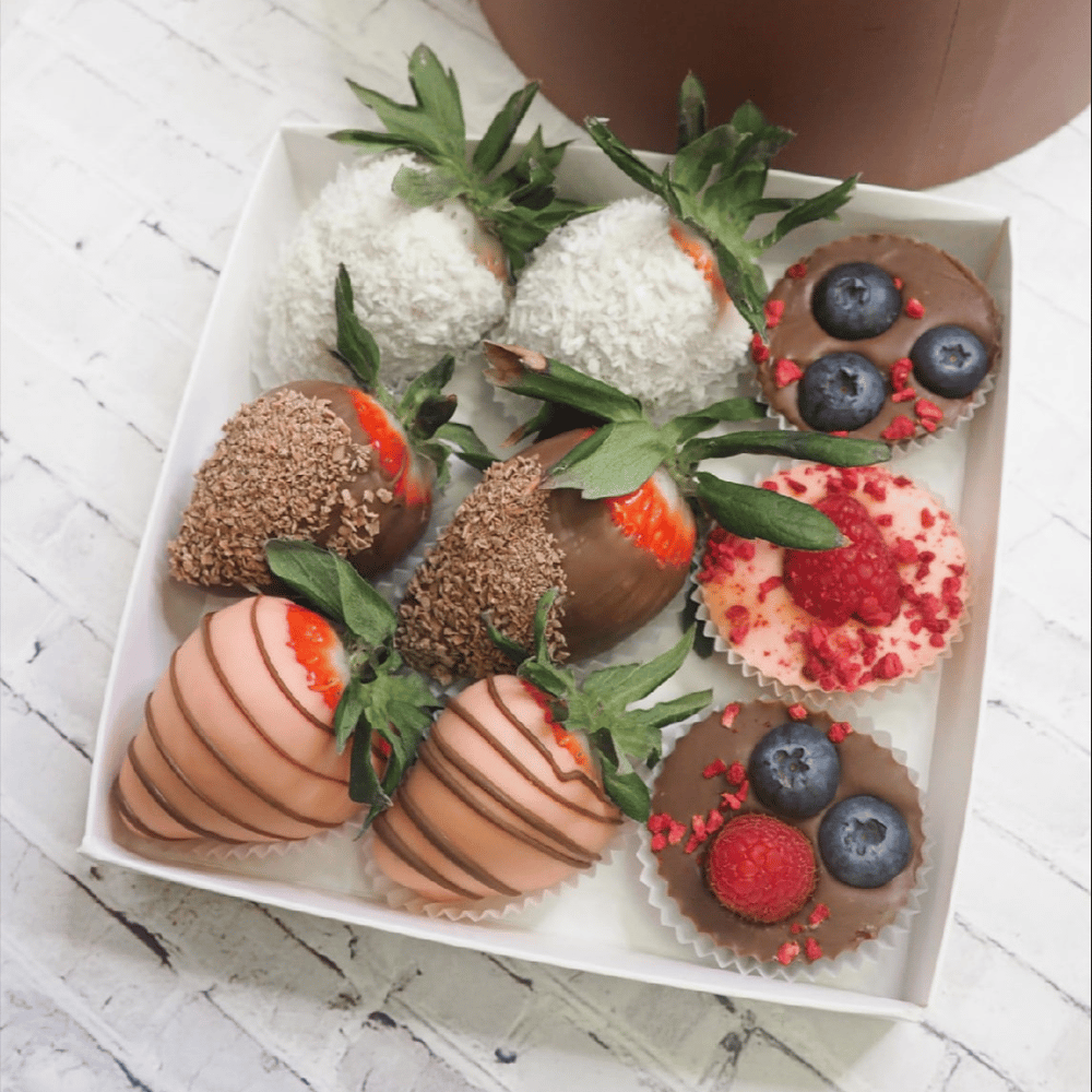 Клубника в бельгийском шоколаде 6 шт и конфеты с ягодами 3 шт, посыпки (кокосовая и шоколадная стружки) Размер коробочки 15 * 15 см Рекомендуемый срок хранения 24 часа (в прохладном месте, при температуре от +1 до +7)