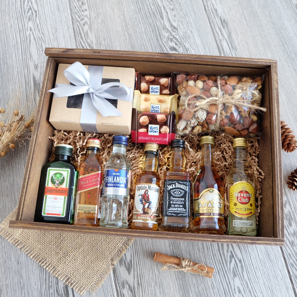 В наборе: 📌Деревянный бокс 29*22*9 см 📌Ликер Егермейстер 40 мл 📌Виски Red Label 50 мл 📌Водка Finlandia 50 мл 📌Ром Captain Morgan пряный 50 мл 📌Виски Jack Daniel’s 50 мл 📌Коньяк Арарат пятилетний 50 мл 📌Ром Havana Club 50 мл 📌Арахис в темном шоколаде 📌Ореховый микс 📌Шоколад Ritter Sport mini