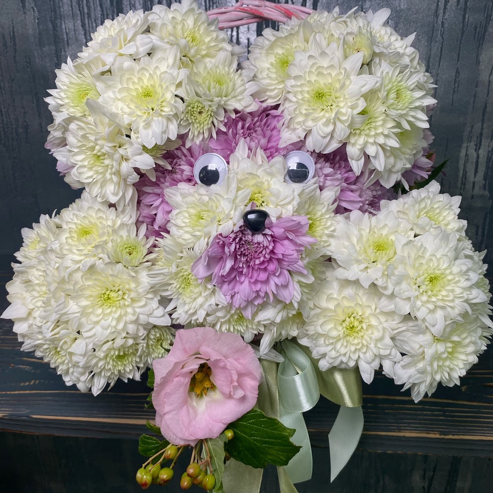 Мишка из двух видов хризантем. Живые цветы получают воду из флористической основы на которой изготавливается мишка. При правильном поливе цветы сохраняют свежесть более 2 недель.