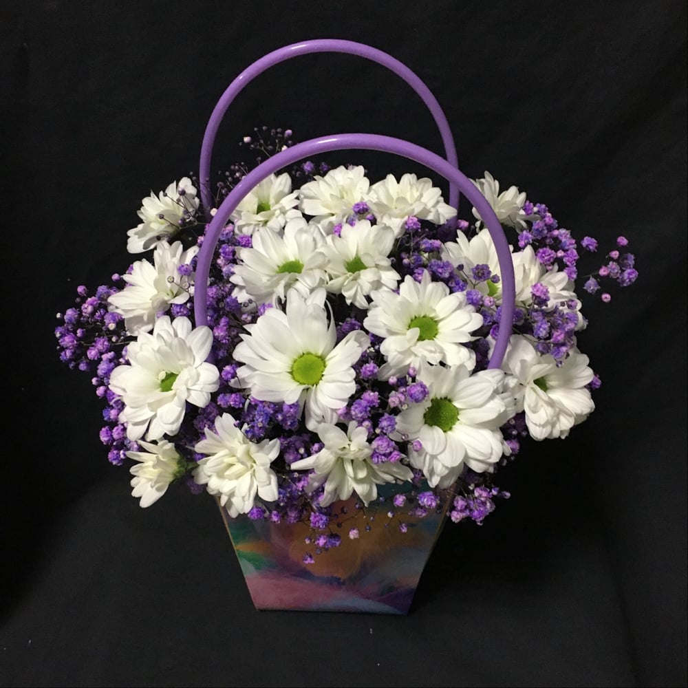 Нежная композиция из хризантем и гипсофилы, порадует своей нежностью и стойкостью.