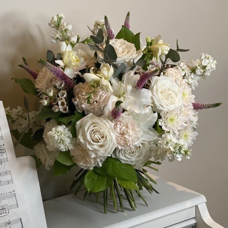Нежный, интересный, современный, нетривиальный букет невесты с розами, гвоздиками, Вероникой и маттиолой. Необычное исполнение и классическая шарообразна форма подходят для свадеб разных стилистик: от классики и минимализма до винтаж и французского стиля.