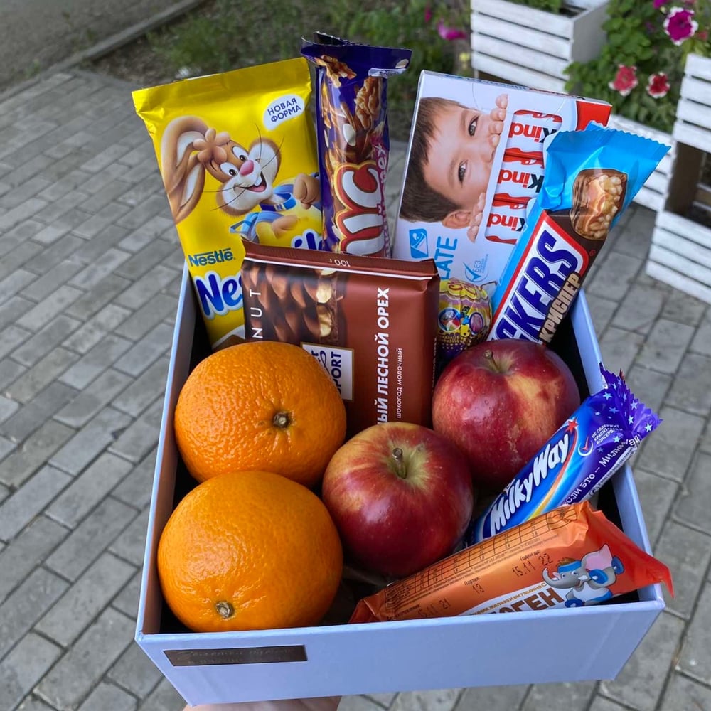 Такой подарок очарует любую девушку и подарит отличное настроение. Состав: апельсин - 2 шт., яблоко - 2 шт., шоколадка Пикник - 1шт., шоколадка Сникерс - 1 шт., шоколадка Ритер Сопрт - 1 шт., шоколадка Милкивей - 1 шт., плитка шоколада Несквик - 1 шт., гематоген - 1 шт., Шоколад Киндерсюрприз - 1 шт.