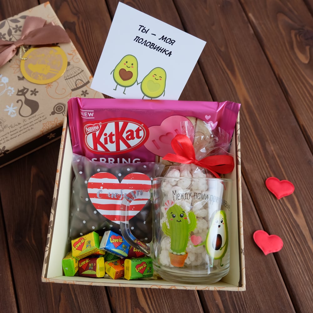 В наборе: 📌Коробка 16*16*9 см 📌Кружка 200 мл 📌Шоколад со вкусом малины и с хрустящей вафлей KitKat 📌Арахис в сахаре 📌Арахис в темном шоколаде 📌Жевательная резинка Love is 📌Открытка