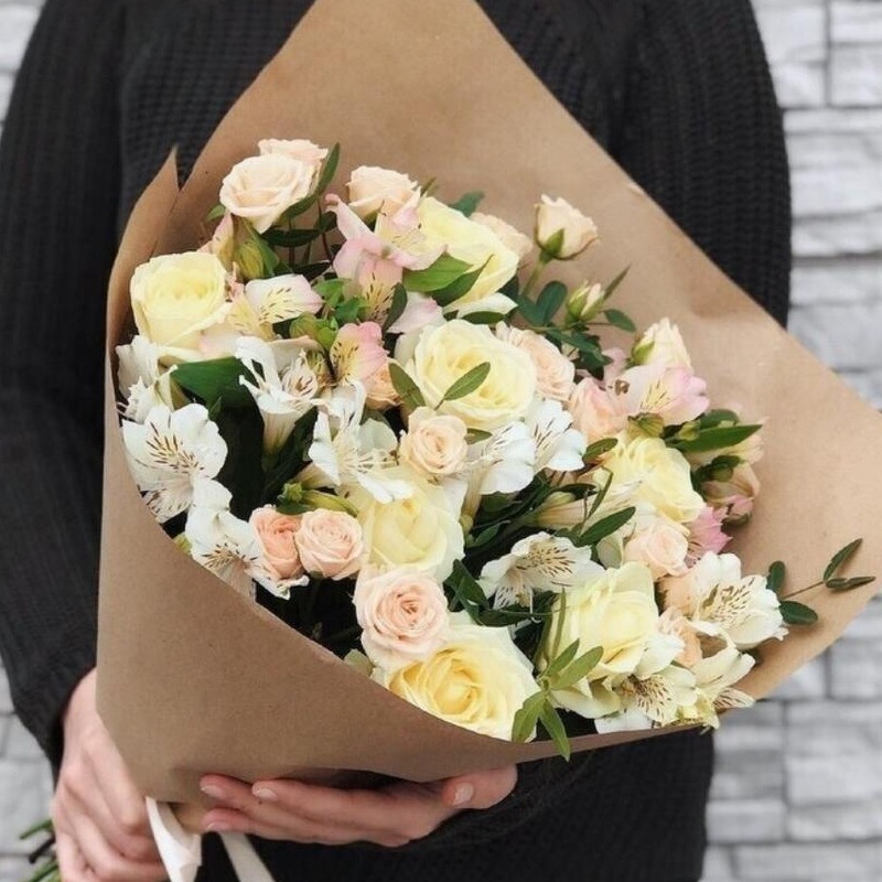 Букет «Молочный» из роз и альстромерий