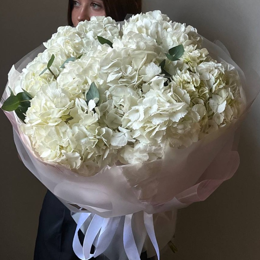 Объемный букет из 7 гортензией с добавлением эвкалипта