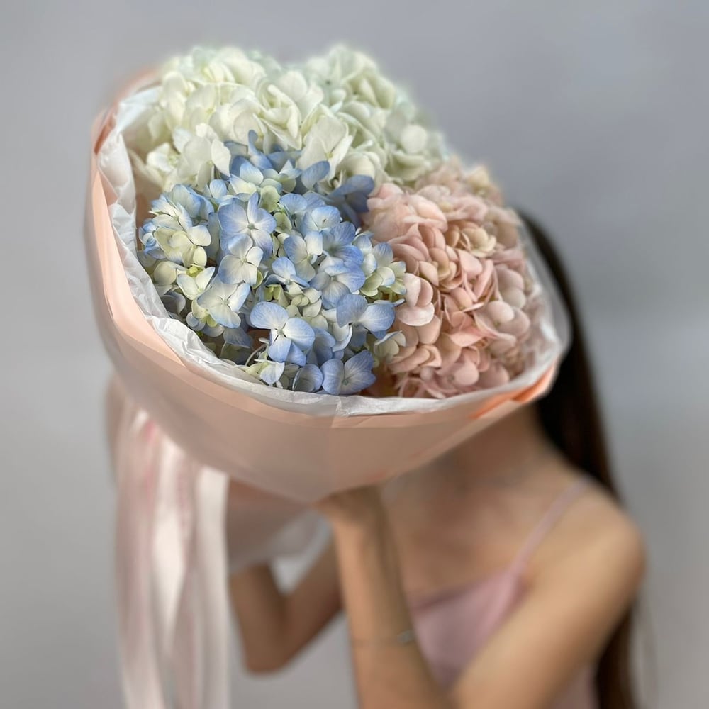 Букет из розовой, белой и голубой гортензии,в круглой упаковке. В подарок к букету : -открытка с вашими пожеланиями -инструкция по уходу за букетом -средство для продления стойкости цветов