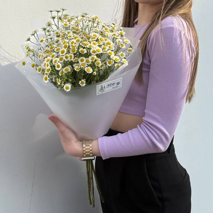 Моно букет из 5 кустовых ромашек в прозрачной упаковке. Отличный вариант для украшения интерьера или подарка без повода