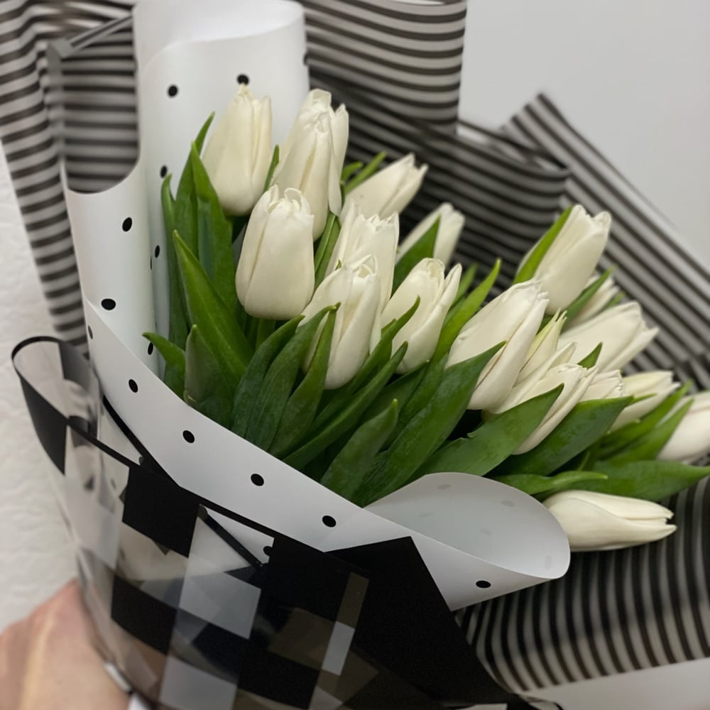 Букет из 19 белых хрустящих тюльпанов в черно-белой упаковке
