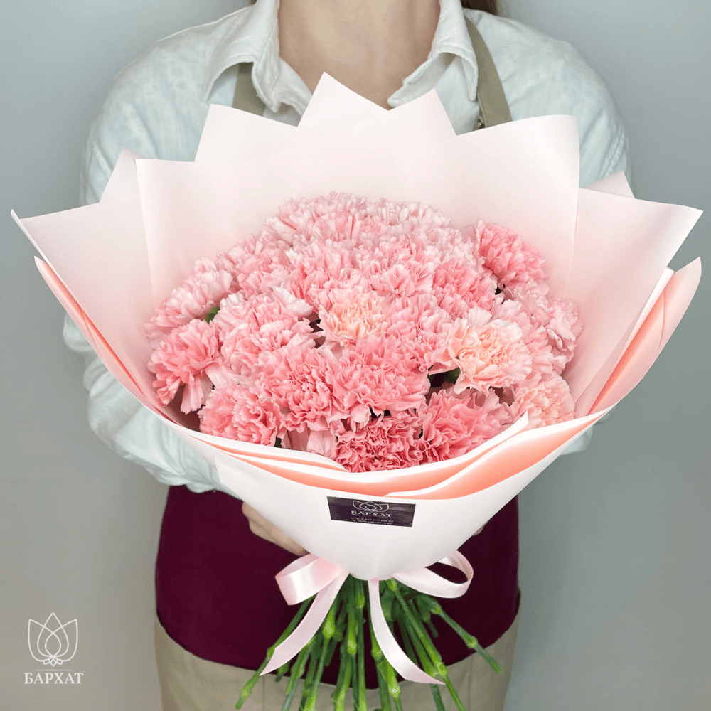 Монобукет из свежих цветов. Упаковка - флористическая пленка, лента, фирменная наклейка.