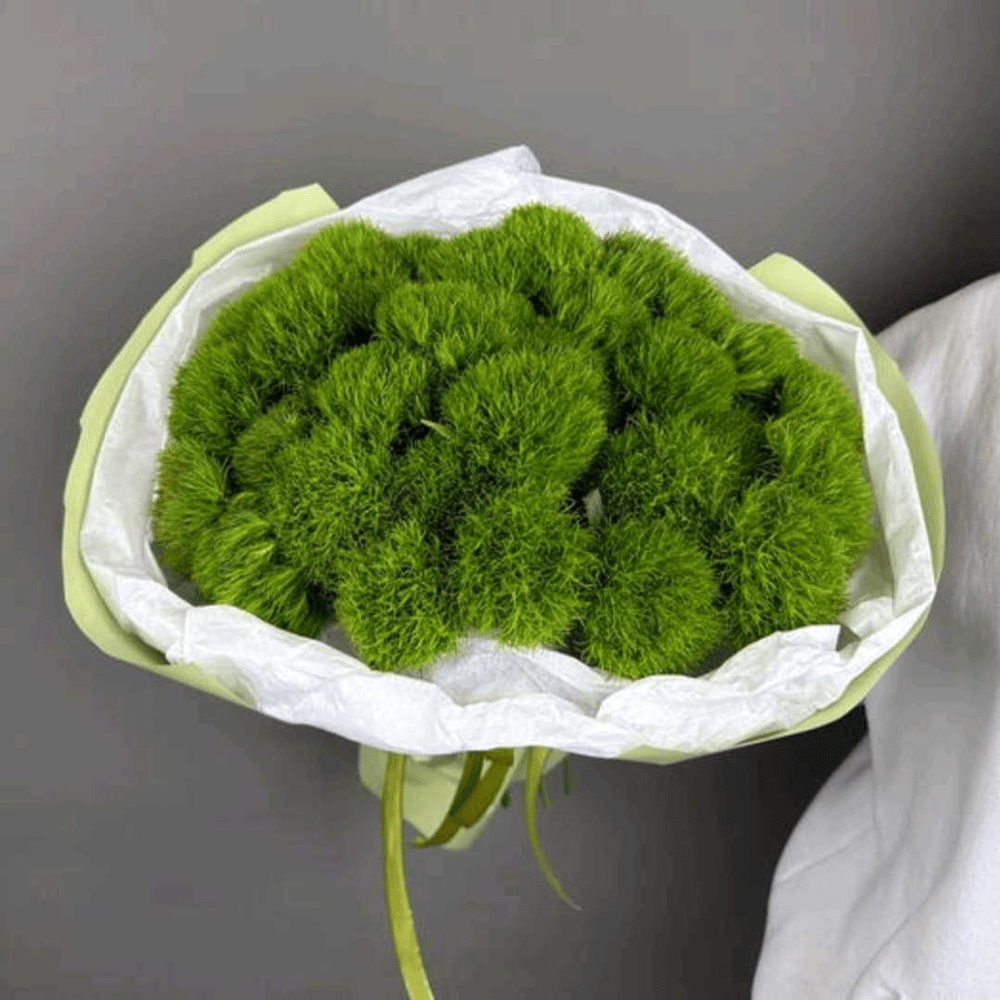 Монобукет из 35 диантусов в зелёной упаковке из гвоздик