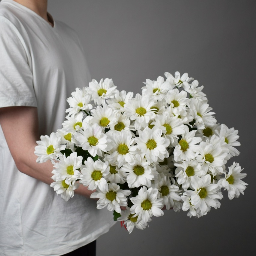 Воздушный монобукет из 5 белых кустовых хризантем - воплощение нежности и чистоты Представляем вам изысканную композицию из 5 белоснежных кустовых хризантем, создающую эффект невесомого облака свеже…