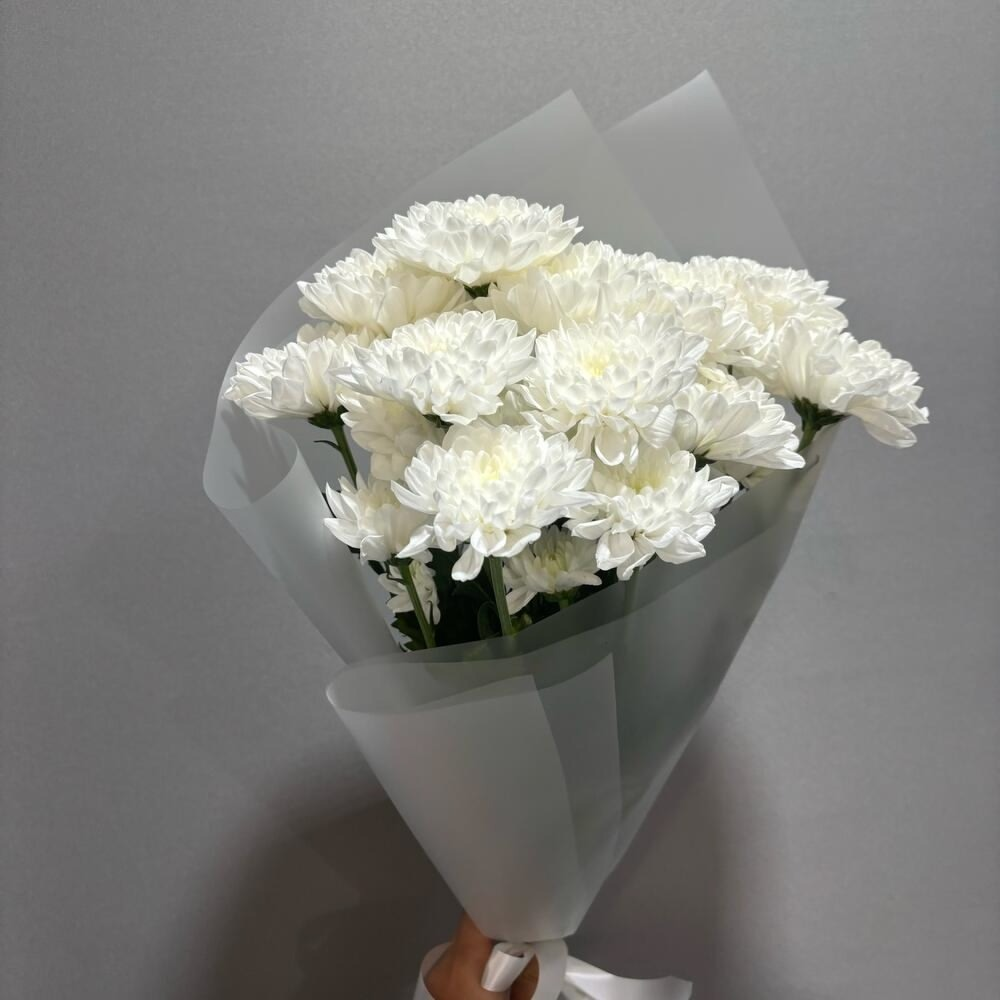 Воздушный монобукет из кустовых хризантем - нежность и элегантность в каждой детали! Представляем утонченную композицию из трех роскошных кустовых хризантем с ромашковым типом соцветия. Особеннос…